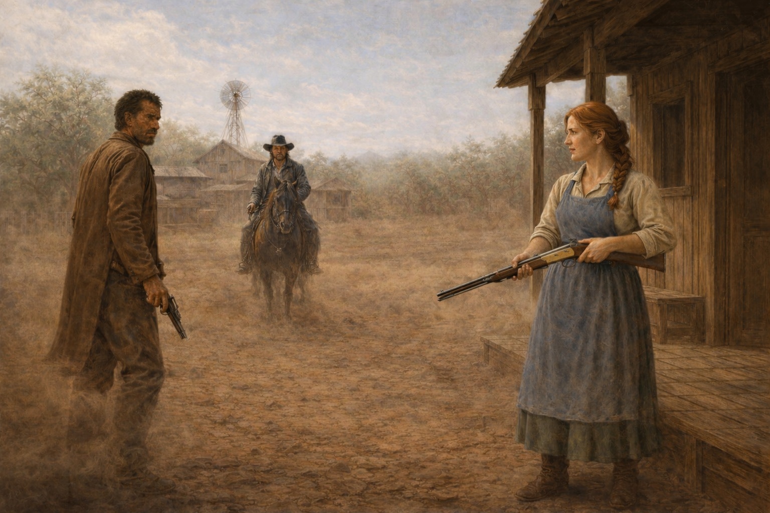 Bland swung down, grinning. “You wouldn’t shoot me. You ain’t got the guts.” His hand dropped for his gun. Mary saw it as it happened. The revolver cleared leather. Her shot cracked the yard. Bland cried out, clutching his wrist as the gun fell.